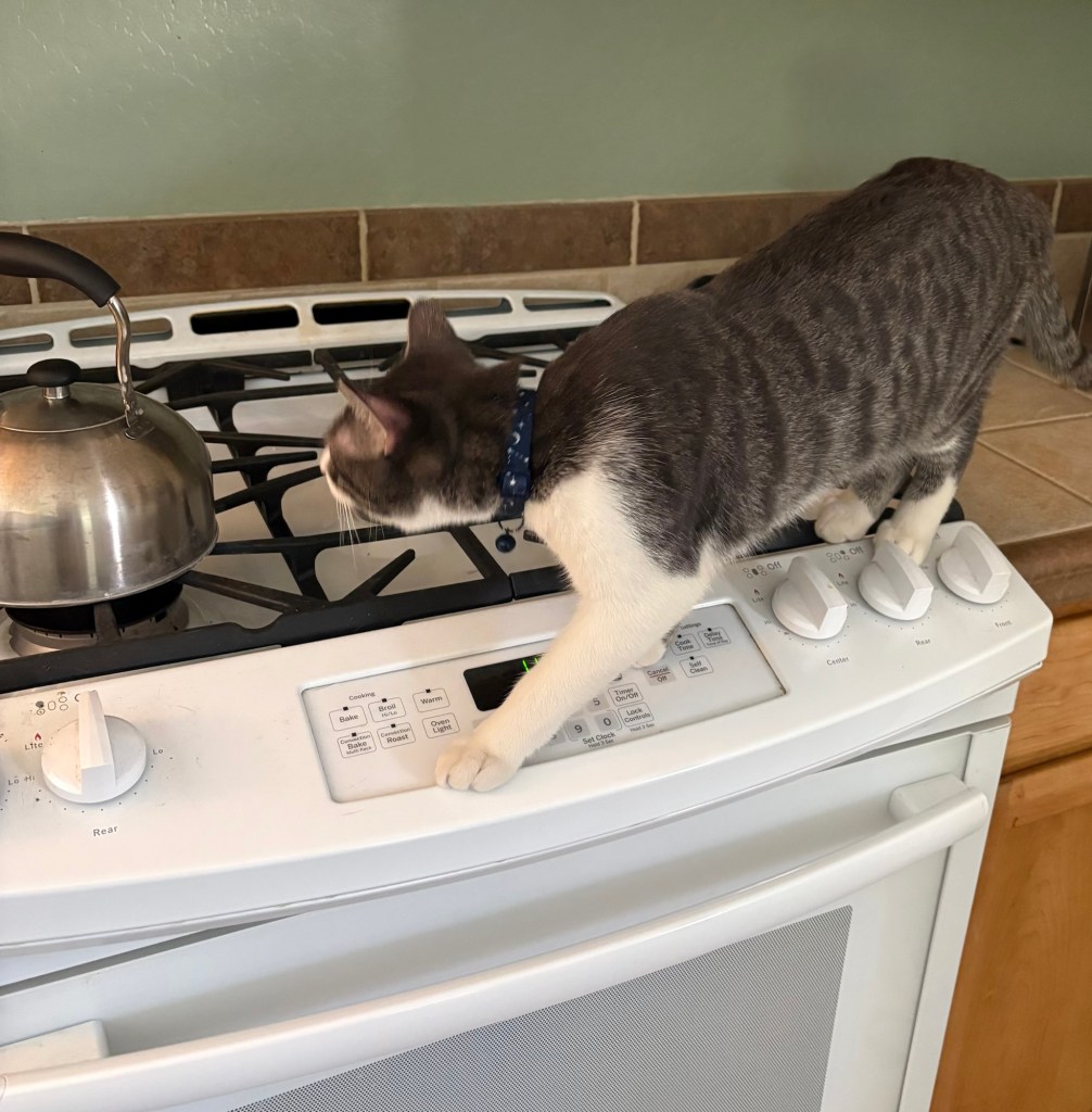 What makes me laugh the most right now is watching my ten‑month‑old kittens play, especially JJ. He is absolutely wild and does the funniest, craziest things, like the photo I have of him casually walking across the stove like he owns the place.